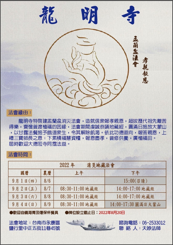 好消息!永康龍明寺2022年敬親孝月盂蘭盆法會預計於國曆2022年9月1日-9月4日(農曆八月六日-八月九日),敬請各界佛友,師兄師姐踴躍報名,參加法會,共霑法益!